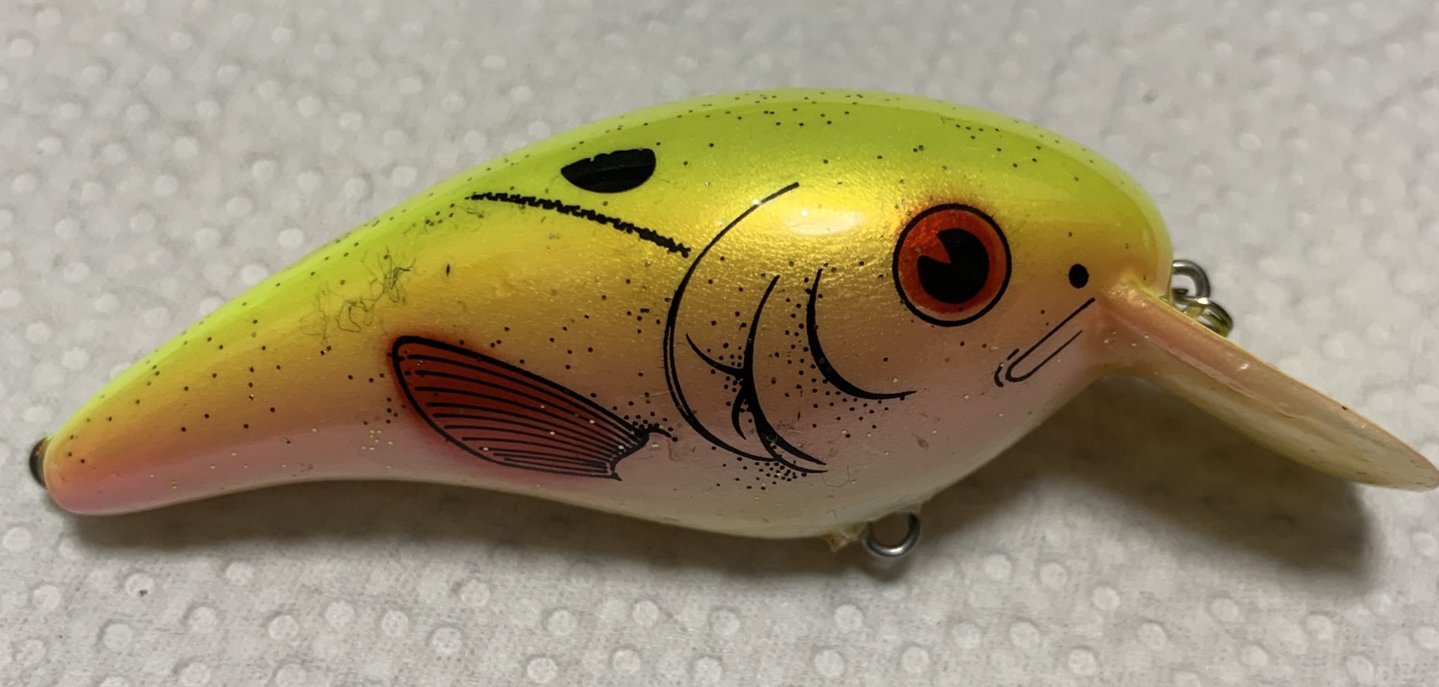 このルアーの名前はストライクキングのリトルSというモデルで、リアフック周りの穴は塗装した際の名残という事が一瞬でtwitterのルアーに詳しい方々によって判明しました。